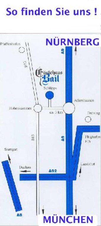 Verlassen Sie die A 9 an der Ausfahrt Allershausen, folgen Sie den Schildern nach Hohenkammer (links!). Nach ca. 3 km weist Ihnen ein Schild den Weg nach Schlipps zum GÄSTEHAUS BAIL!!